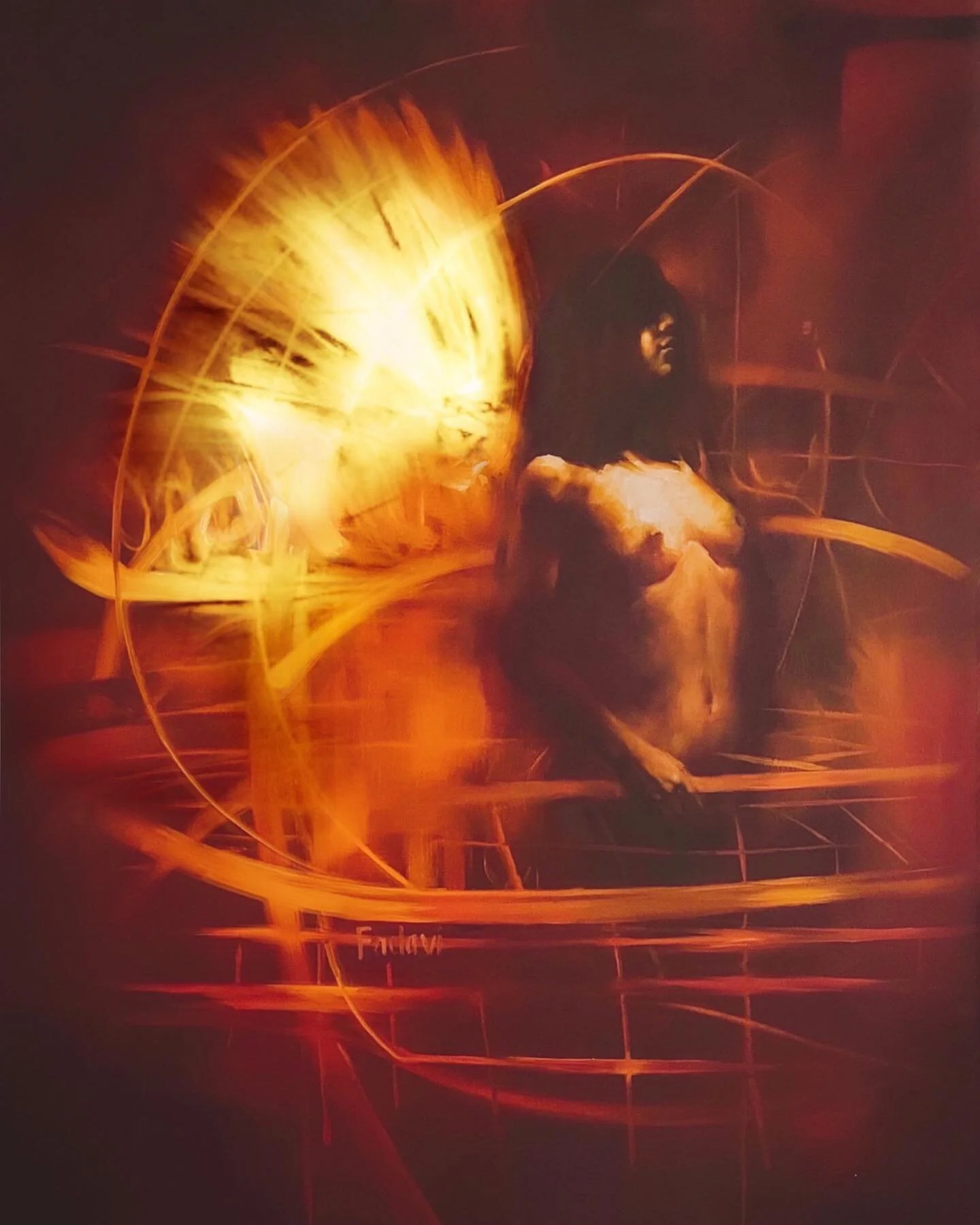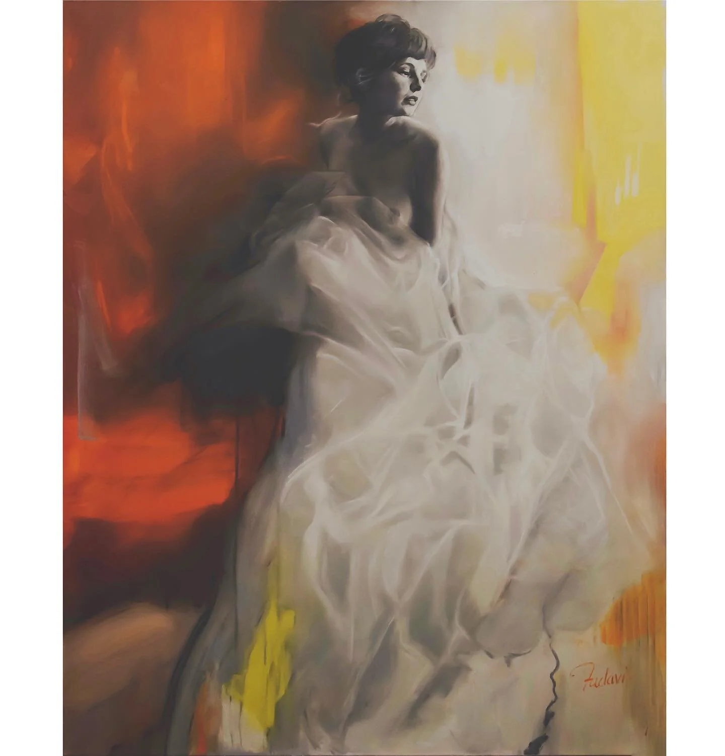 My series of representational figurative paintings, "Journey," captures my quest for freedom. It spans three periods of my life. The first portrays my early life in Iran, marked by confinement due to post-1979 revolution restrictions and human rights violations. The second depicts my years of displacement in Thailand, waiting for resettlement while grappling with instability.